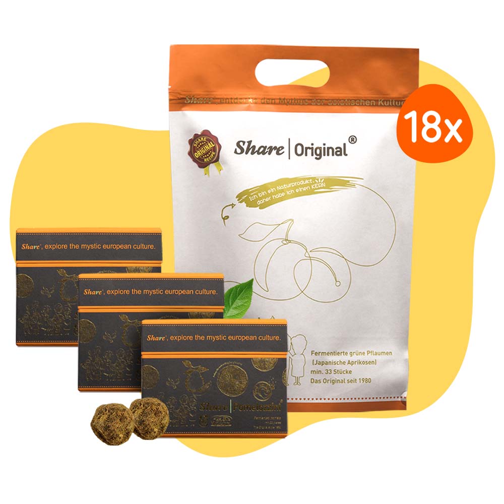Es gibt keine fixe Formel. Grundsätzlich berichten unsere KundInnen, dass sie eine ShareOriginal®-Pflaume täglich essen. Viele essen die Produkte 12 Monate oder länger. Da es sich bei unseren Produkte nur um fermentierte Lebensmittel handelt, kannst du diese essen so oft und lange du willst. Wir essen zum Beispiel gerne eine ShareOriginal®-Pflaume vor dem Schlafen gehen.